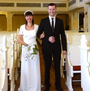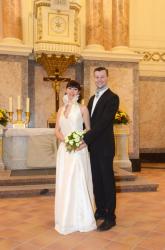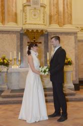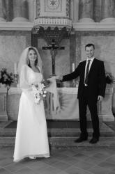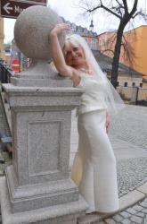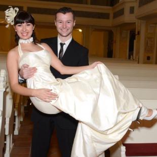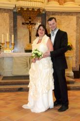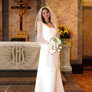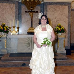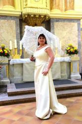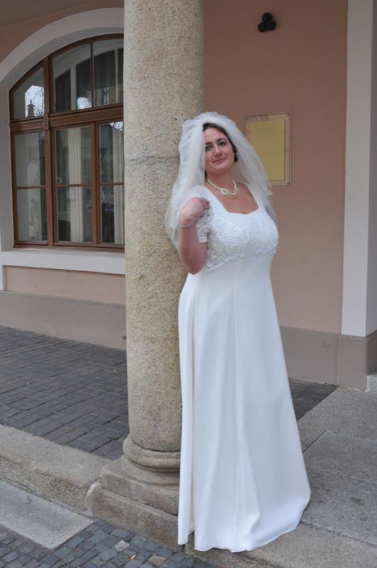 Wunderschönes und vorteilhaftes Brautkleid in großer Größe: Korsage mit Schnürung und langer Rock mit Schlitz.