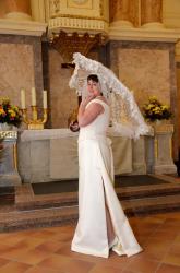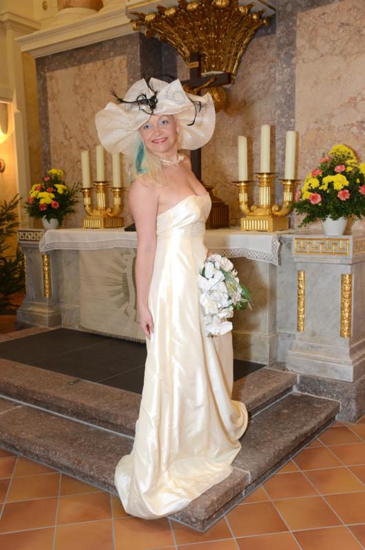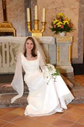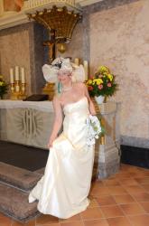 “Königinnenkleid” mit hochstehendem Fächerkragen, etwas ganz Besonderes für den einzigartigen Tag im Leben. Erstklassiger Taft aus Holland wurde hier zu einem Haute Couture – Hochzeitskleid verarbeitet.
