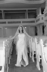 Enganliegendes Brautkleid mit Schwalbenschwanz und langem Schlitz.