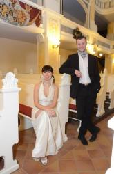 Herrlich figurbetonte Korsage und langer Rock mit Schleppe und Kropfband.