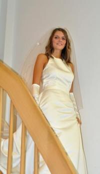 Mareike trägt ein wunderschönes, schlichtes, cremefarbenes Brautkleid von “La Sposa” in Größe 38 mit einer sehr langen Schleppe.