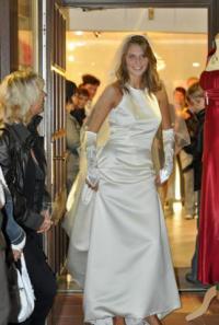 Dazu trägt sie lange Satinhandschuhe mit einer aufwendigen Perlenstickerei und einen zwei Meter langen Schleier mit kleinen Röschen.