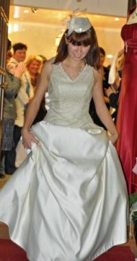 Nicole trägt ein sensationelles, weißes Kleid von “Demetrios” in Größe 42. Der obere Teil des Kleides, die Ärmel sowie der Saum und die gigantische Schleppe sind in aufwendiger Handarbeit mit Blüten und Perlen bestickt worden. Die Schleppe ist ca. 1,5 Meter lang und abnehmbar.