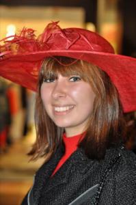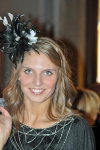 Dazu trägt sie einen kleinen, zarten Hut mit Federn und einer Blüte.