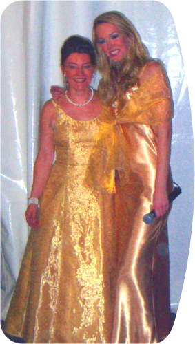 Die Miss Deutschland 2007 trägt ein Satinkleid in Gold aus der FossaDesign - Kollektion und einen goldenen Organzaschal.
